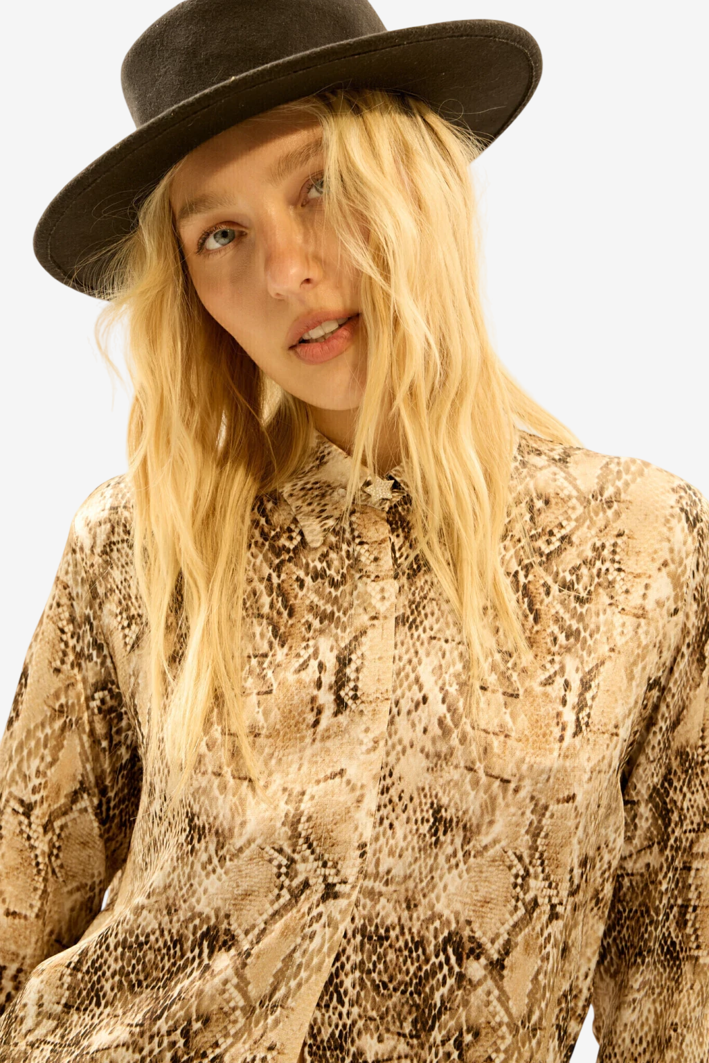 Camisa Phyton Reptil: la prenda que transformará tu look. Con nuestro print exclusivo Phyton que amamos, esta camisa de mangas largas y botones delanteros es ideal para cualquier ocasión. El detalle estrella es su botón de strass que cierra el cuello con elegancia.
