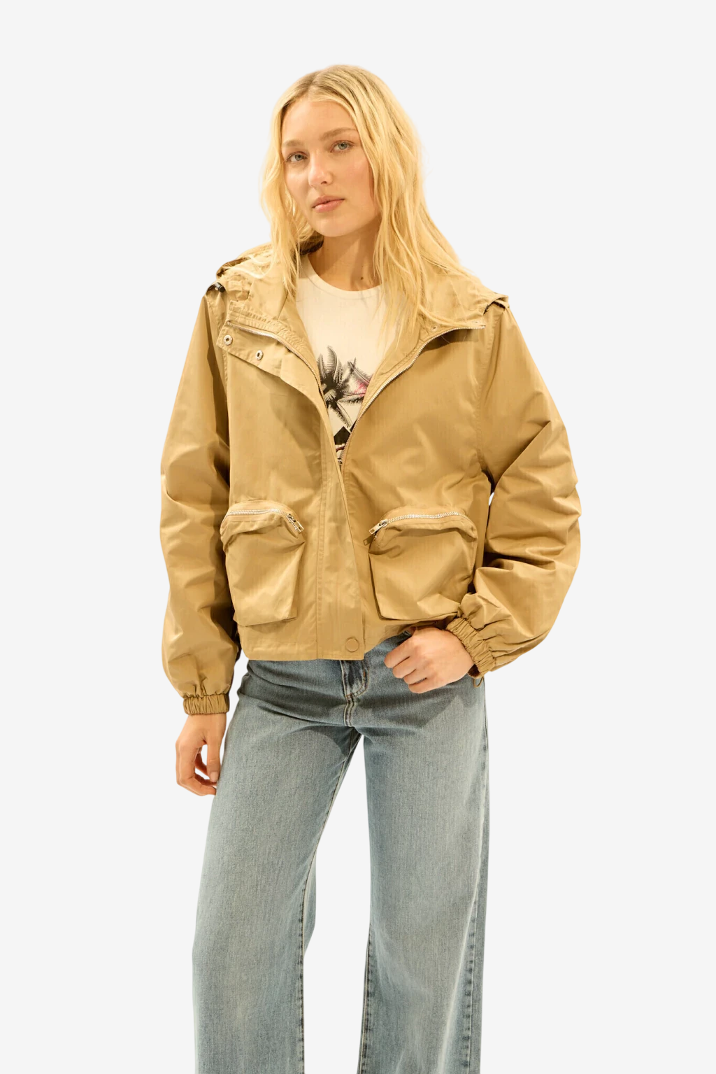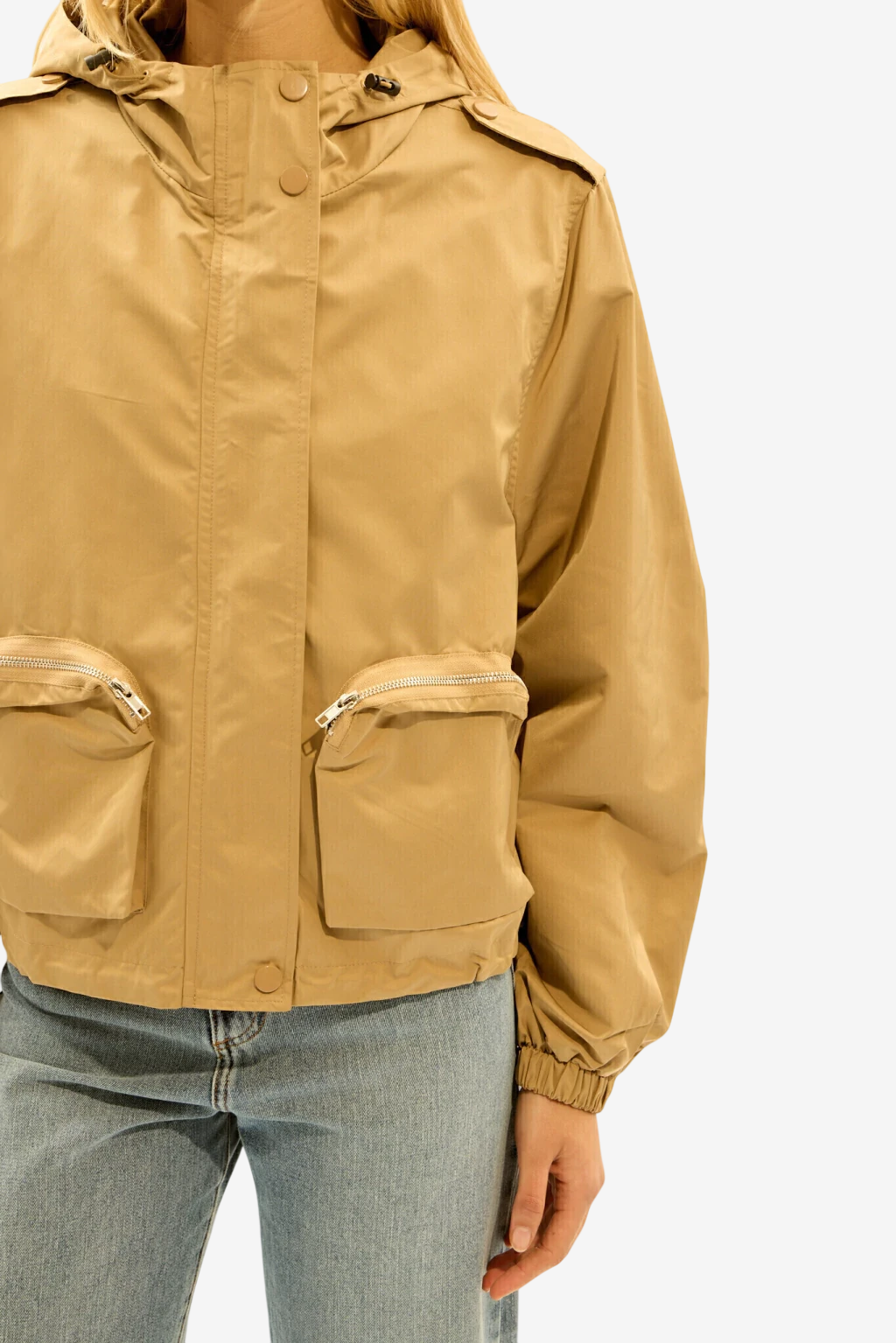 Campera con capucha y charreteras en los hombros. Tiene bolsillos frontales con cierre y es impermeable. Un abrigo liviano para tener todo el año en tu vestidor.