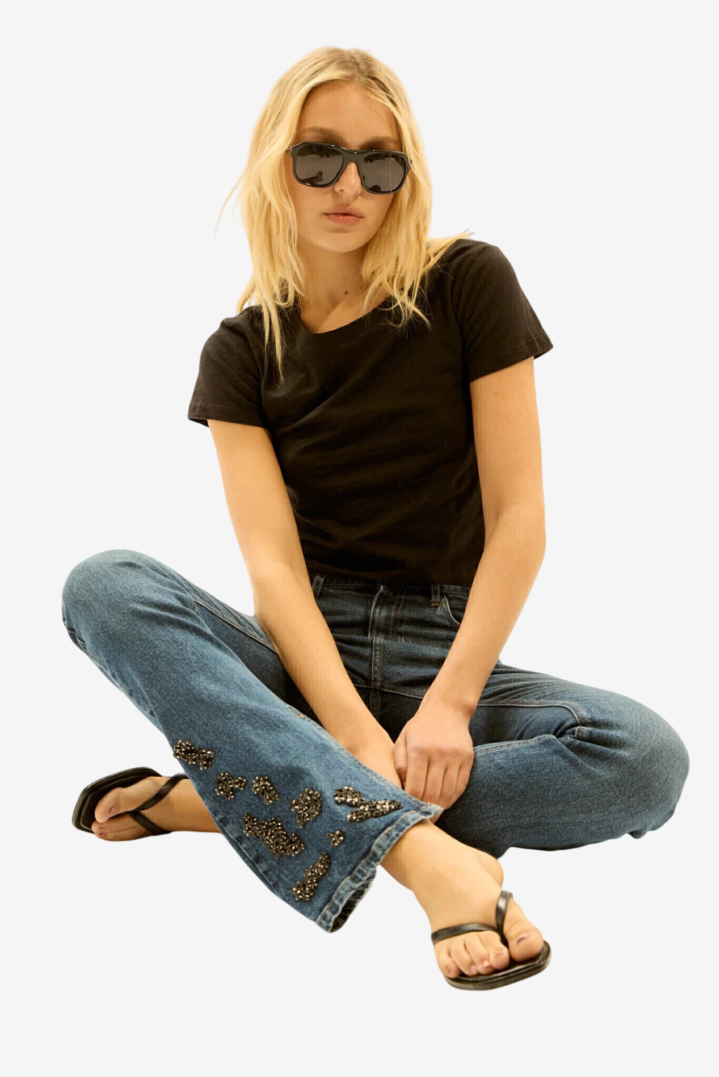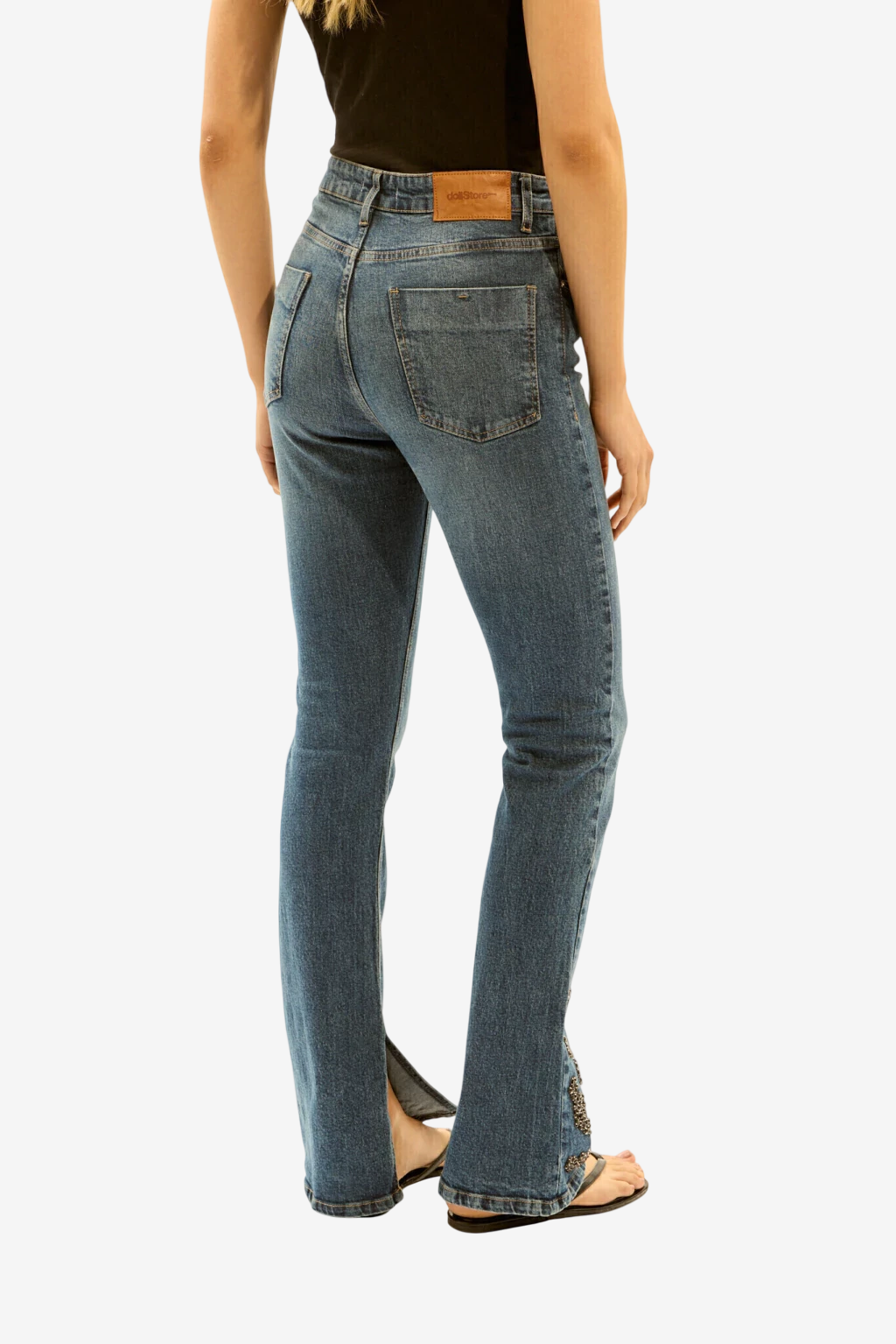 Jean tiro alto con tajo laterial interno en el ruedo, con aplique de strass en ruedo. Calce perfecto. Con un minimo porcentaje elastizado, te garantiza ademas mucha comodidad.