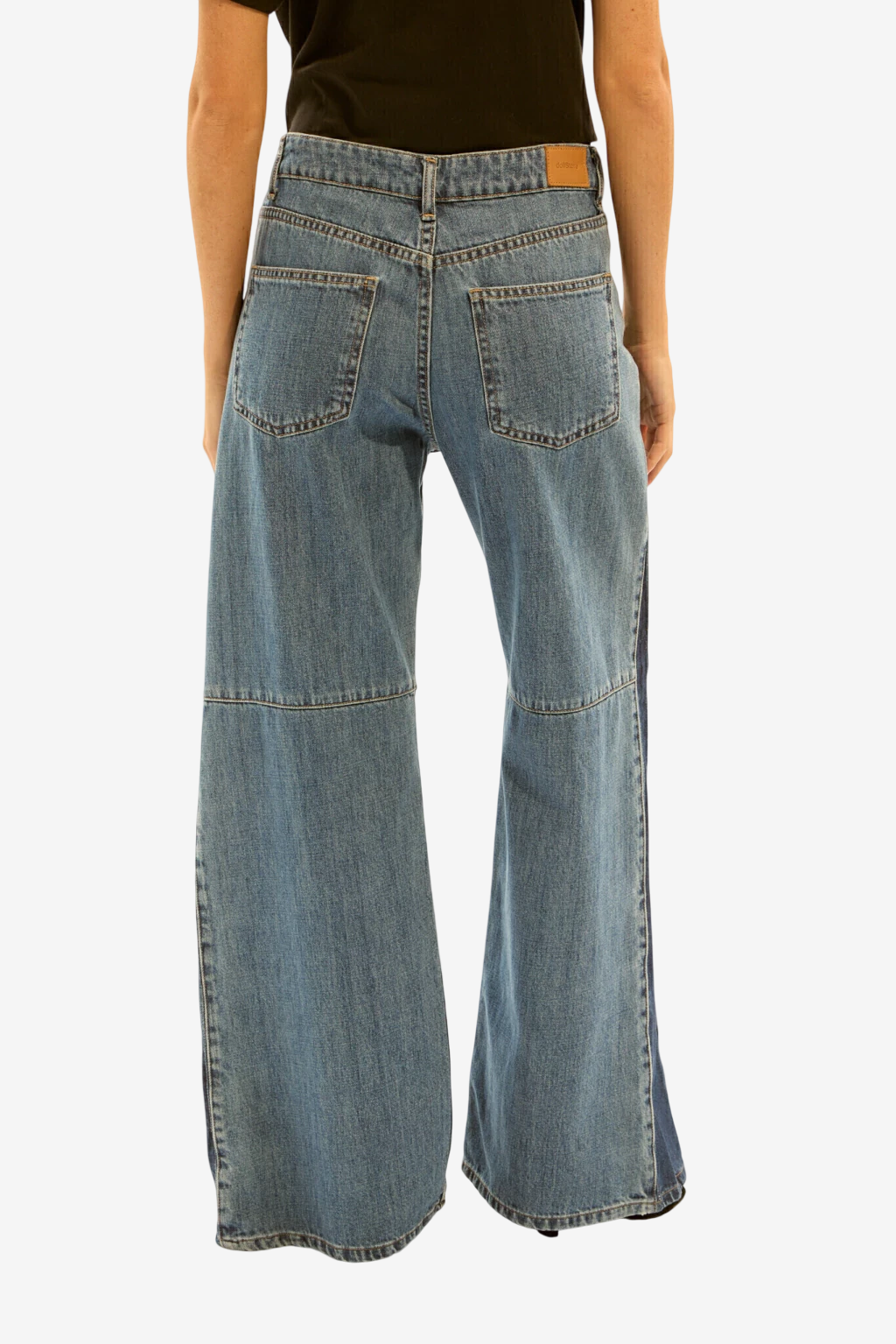 Jean Figo: Estilo y comodidad en una sola prenda. Este jean de tiro alto presenta una pierna ancha que aporta libertad de movimiento y un diseño moderno. Su recorte de distintos tonos de denim en la misma prenda crea un efecto visual único, ideal para destacar en cualquier ocasión.