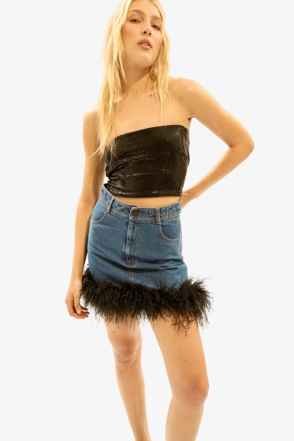 Descubrí la fusión perfecta entre lo clásico y lo moderno con esta pollera de jean de tiro alto, confeccionada en 100% algodón. Su diseño exclusivo incorpora elegantes plumas negras en el ruedo, que le aportan un toque sofisticado y único a tu look. Ideal para destacar con estilo en cualquier ocasión.