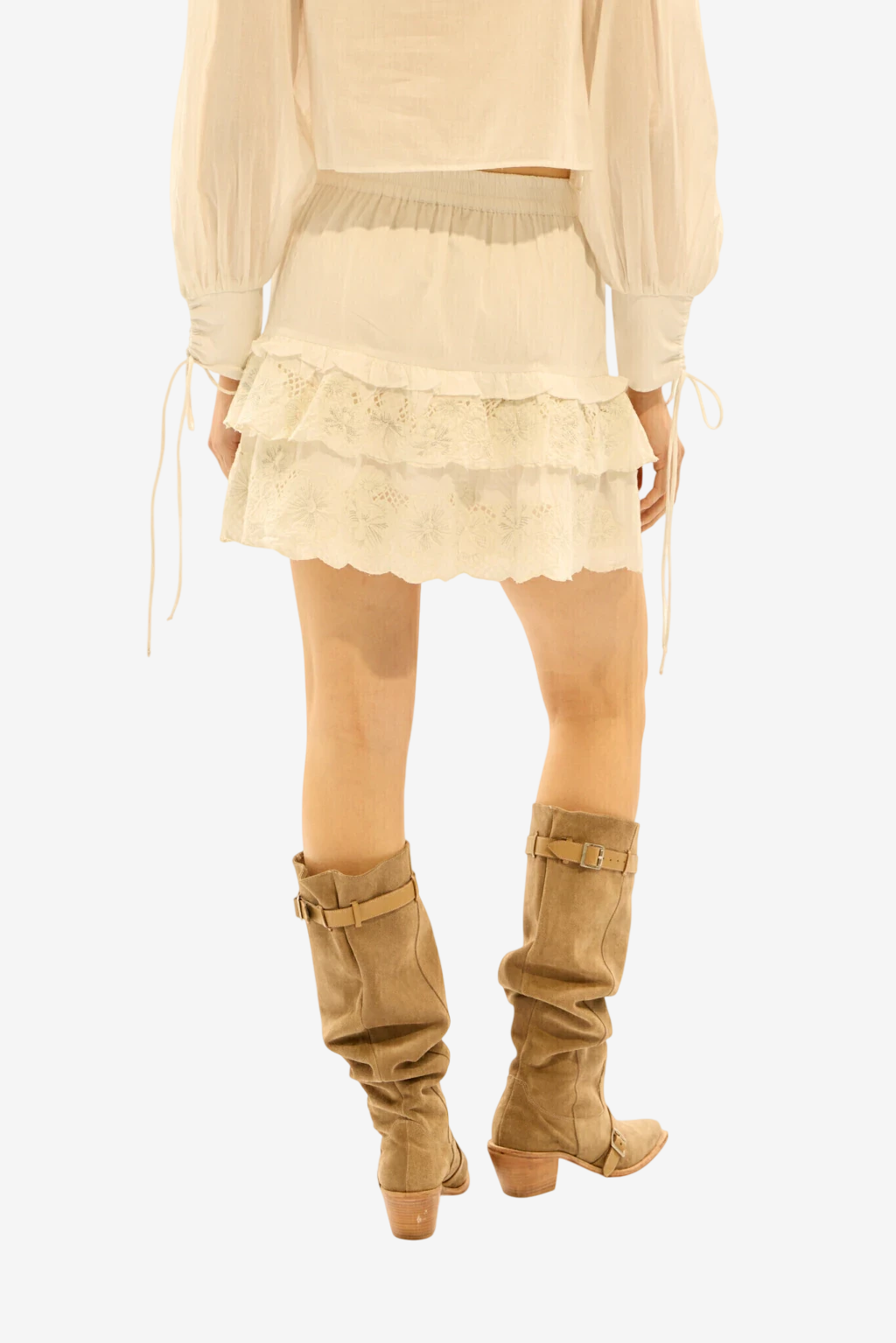 Mini Sunrise Blanco EDICION LIMITADA, exclusivo India: Mini de broderie con elástico en la cintura, diseñado para ofrecer comodidad y estilo. Ideal para combinar con la Blusa Sunrise y sumar una faja, creando un conjunto armonioso y moderno.