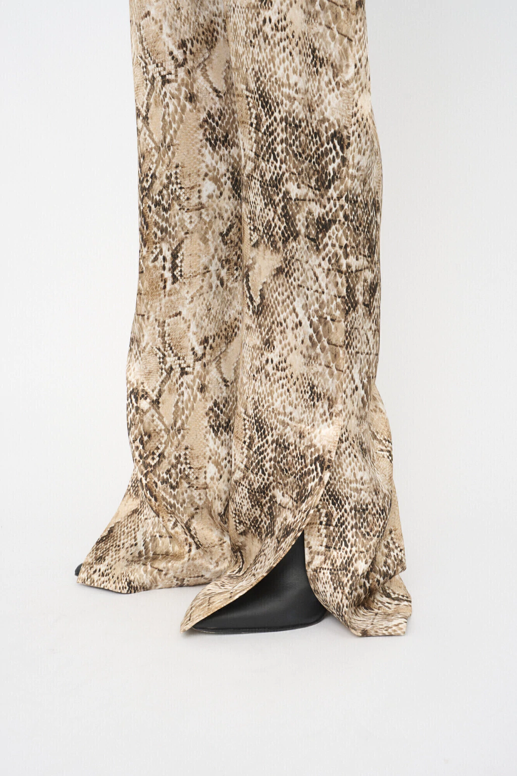 Pantalon en nuestro estampado exclusivo Phyton. De tiro medio con cierre y broche frontal en cintura. El calce es holgado, y tiene en el ruedo de cada pierna, un tajo que genera movimiento. Potenciado por la excelente caida de la tela.