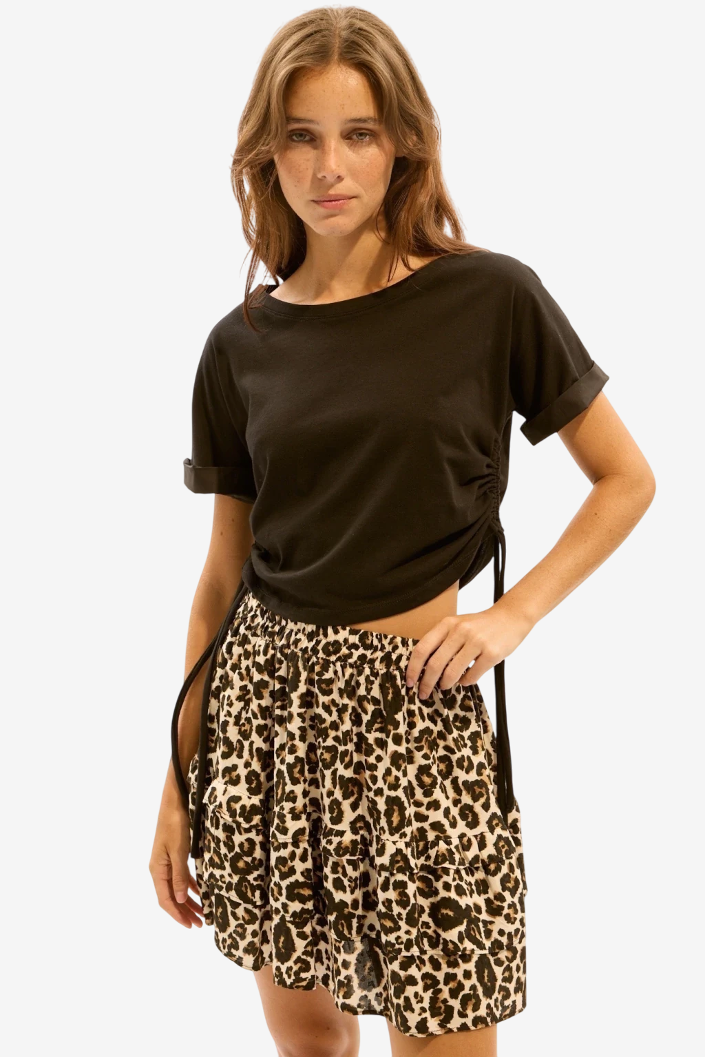 Remera manga corta de algodon. Con detalle de cintas en los laterales que fruncen y "alargan o acortan" la prenda. Ademas, las mangas con en tela combinacion y arremangadas. Una remera original.