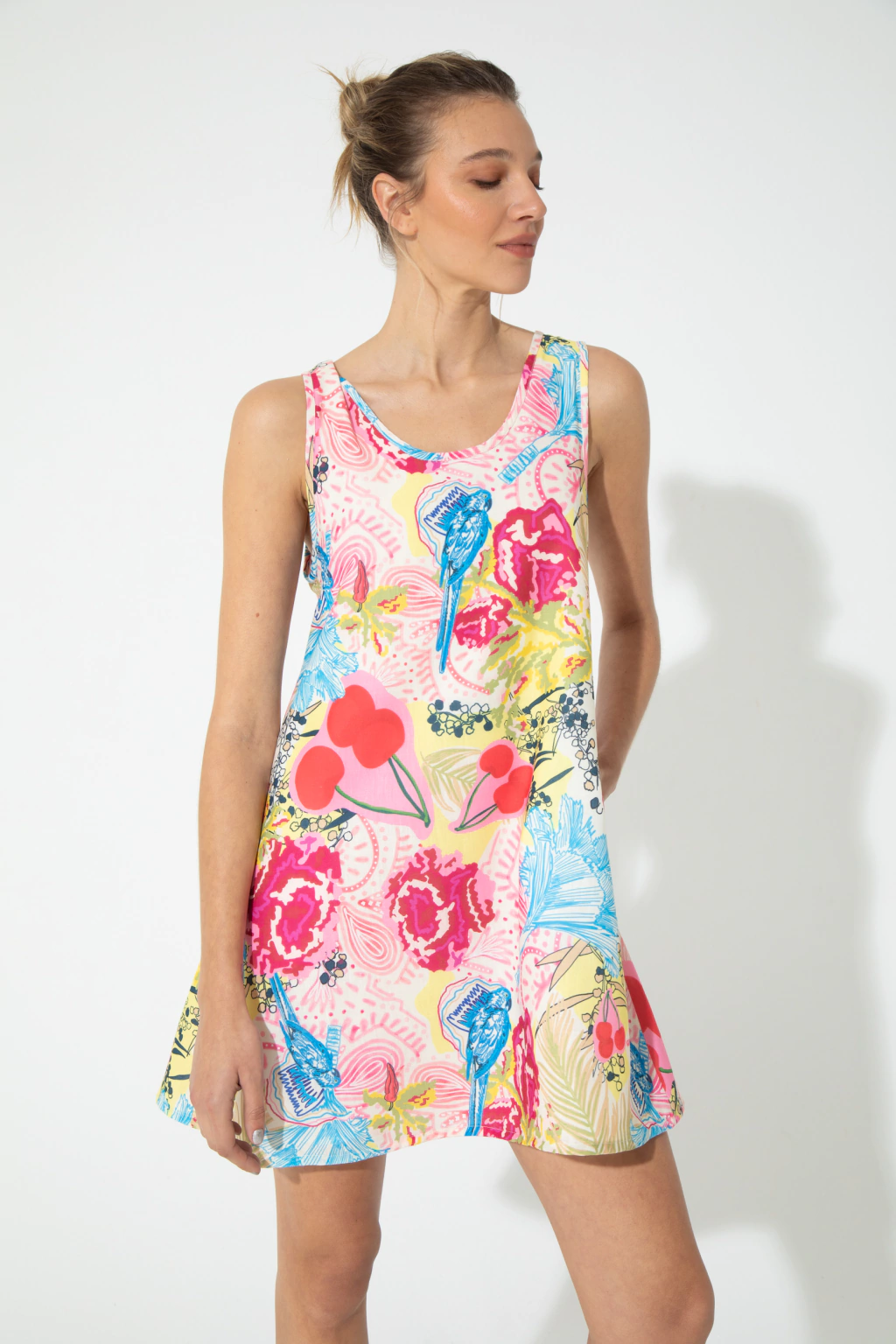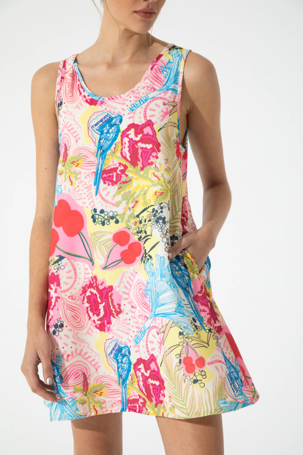 Vestido de lino 100% con estampado exclusibo de Doll, sin mangas y de lineas simples, tiene bolsillos laterales escondidos.